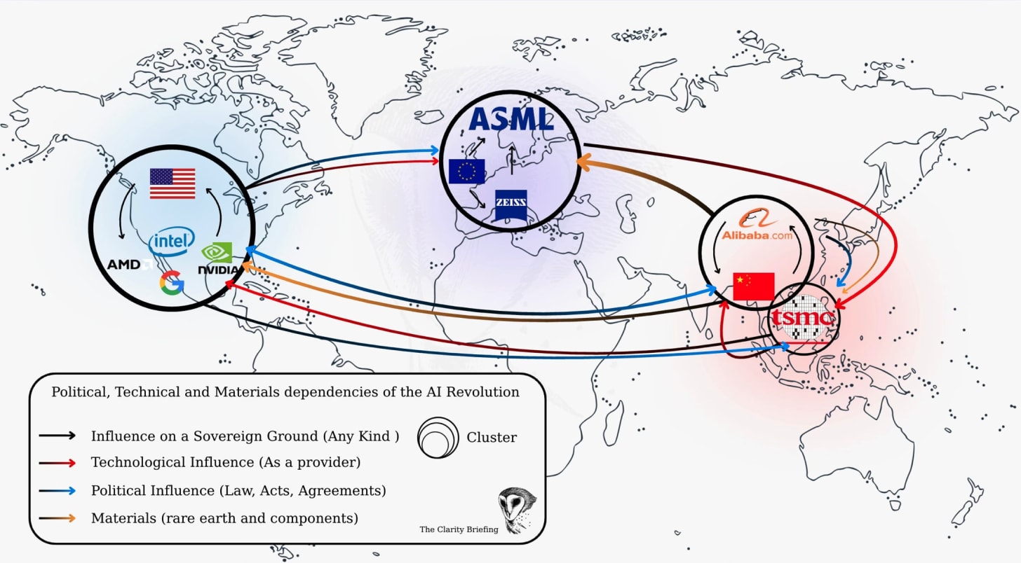 The map shows three industrial cores and the forces that connect them. They influence each other through constraints: political, technological, or material. Each arrow reflects a specific dependency that shapes the AI economy.