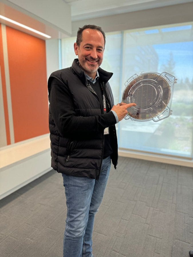 @PatrickMoorhead (3/21/24): Here’s another fun one. The guy who’s smiling (Frank Ostojic) runs @Broadcom’s custom silicon group. He should be smiling as he announced that he has a third XPU design from a large “consumer AI company.” To the right is a close up of the XPU. You can see the 2 compute units on the center and all the HBM to the left and right. A full up custom SoC with lots and lots of compute, HBM, very high speed intra chip connectivity and, as you’d expect, the highest performance external networking.