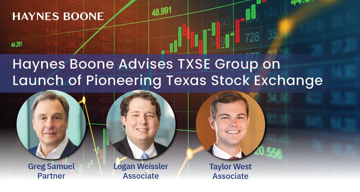WoodRock Securities (Houston) acted as exclusive financial advisor and sole placement agent for TXSE Group Inc. Cravath, Swaine & Moore (Washington, D.C.) serves as regulatory counsel to the Texas Stock Exchange. The Dallas office of Haynes and Boone LLP served as counsel to TXSE Group Inc. in the offering and will serve as corporate counsel. PwC Consulting serves as managed services provider for TXSE Group Inc.